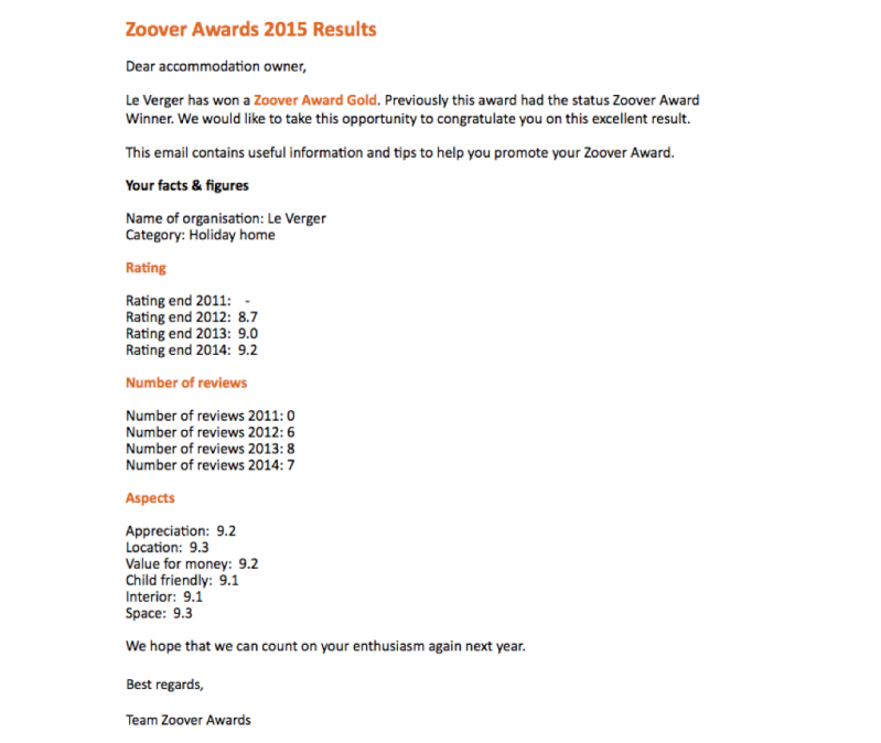 Wij zijn blij dat ook dit jaar vakantiehuis Le Verger weer in de prijzen viel. Als top accommodatie zijn wij er trots op om kwaliteit van het hoogste niveau te leveren! Dank aan alle gasten voor hun beoordeling.